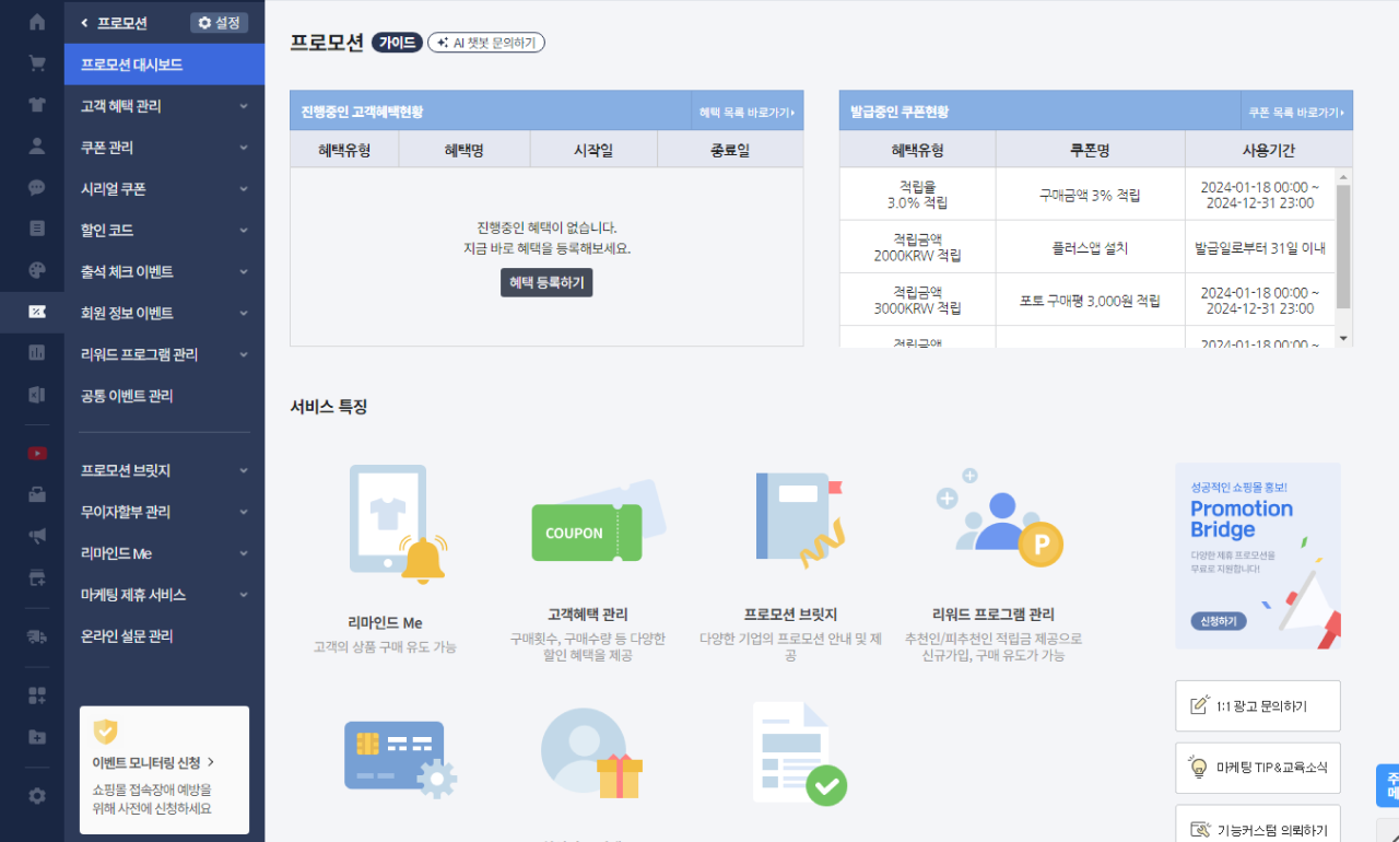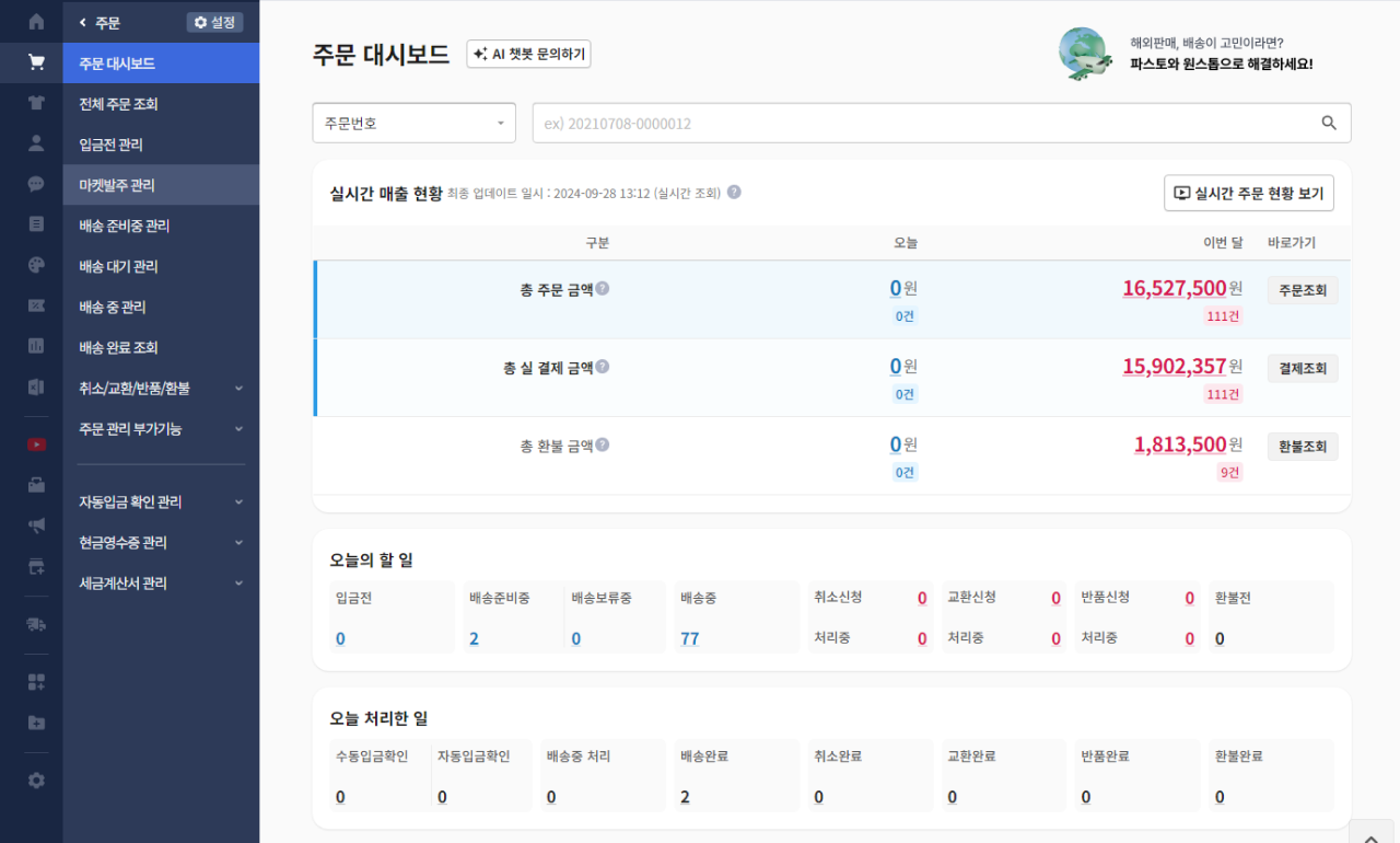 - 통합 솔루션 관리(카페24 마켓플러스, 사방넷, 플레이오토 등)
